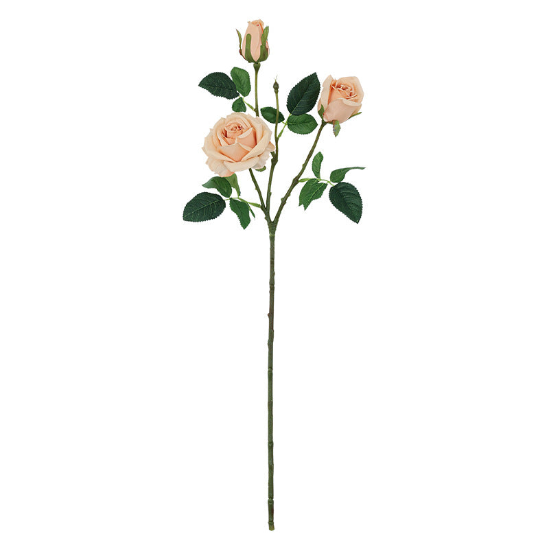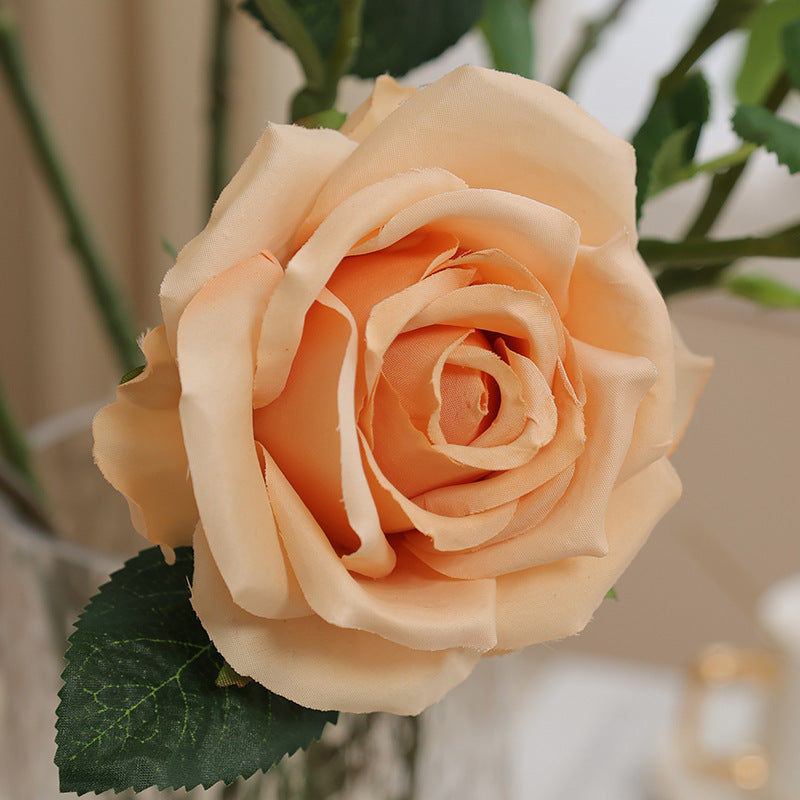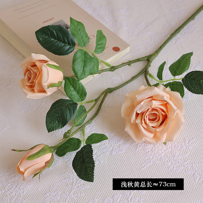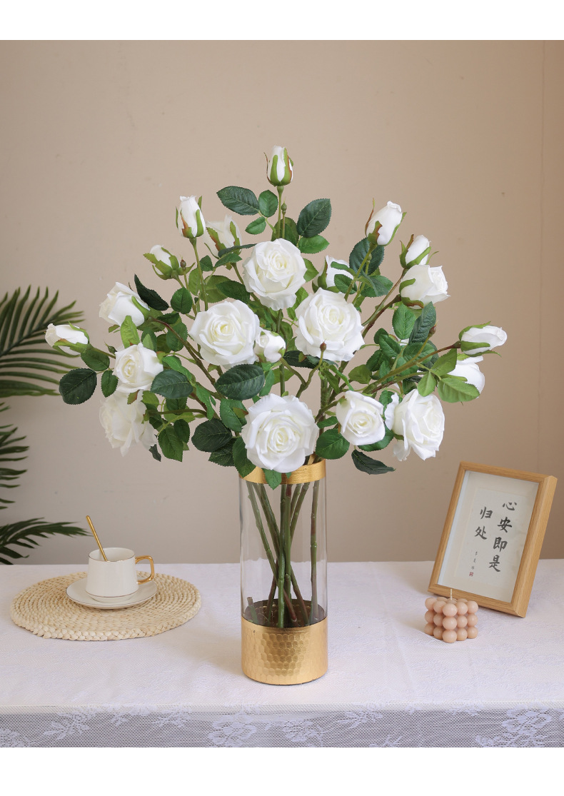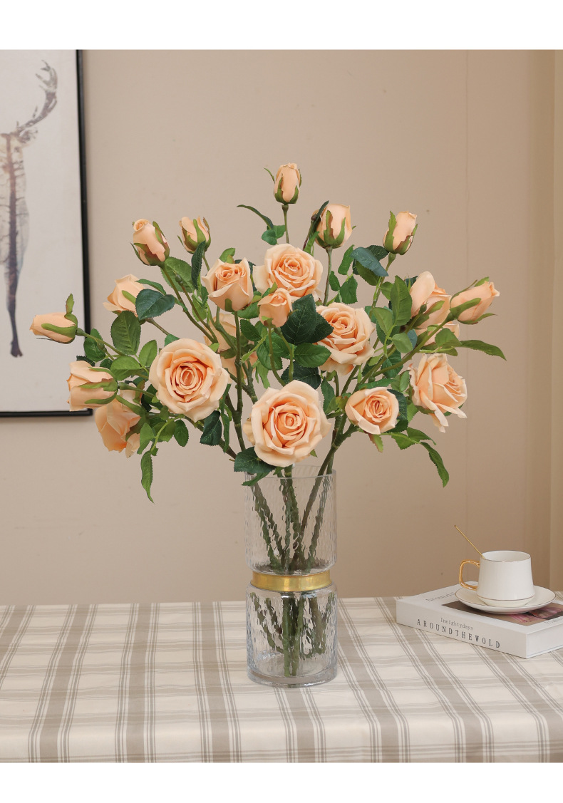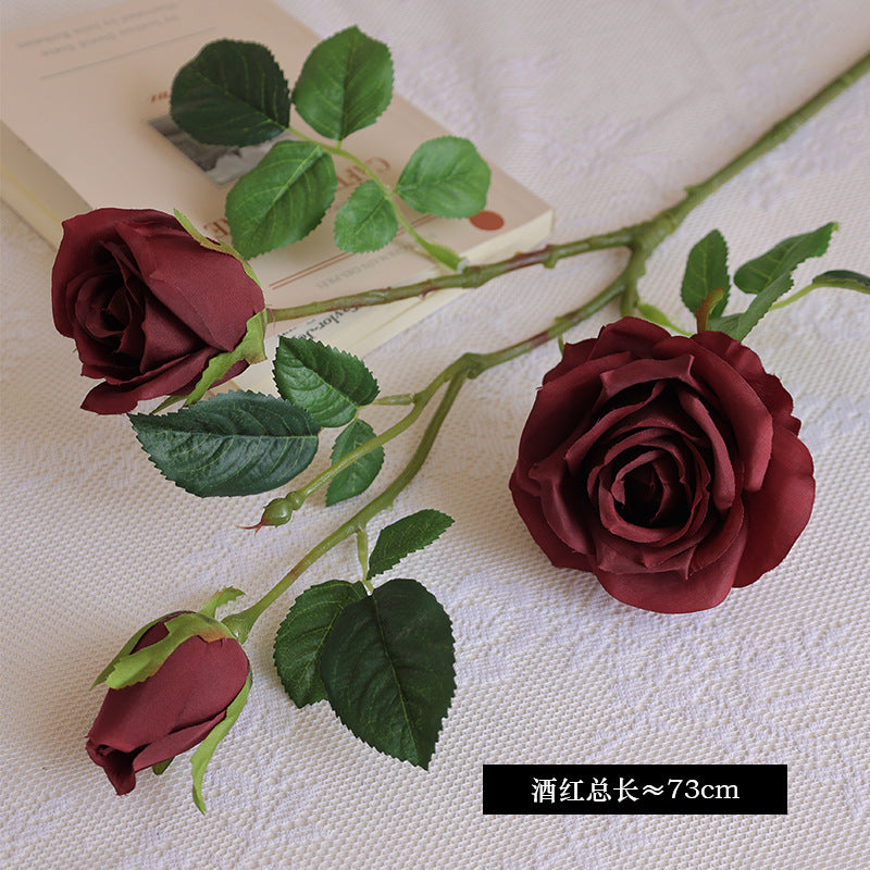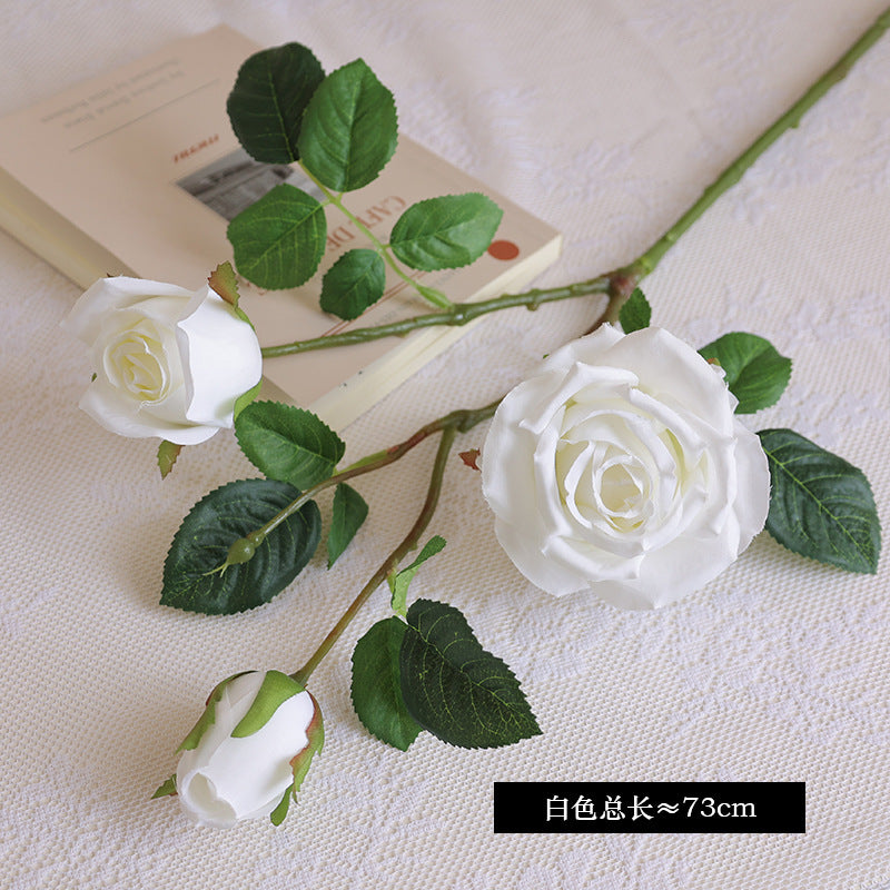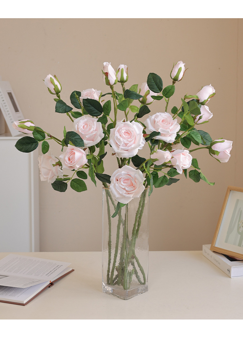 The 3-head design includes fully bloomed, semi-open, and bud stages, replicating real roses' growth cycle. Leaves adopt clean-cut silhouettes with embossed vein patterns, pairing deep and light greens to complement Nordic minimalism. The chiffon's delicate velvety touch achieves over 90% tactile realism.